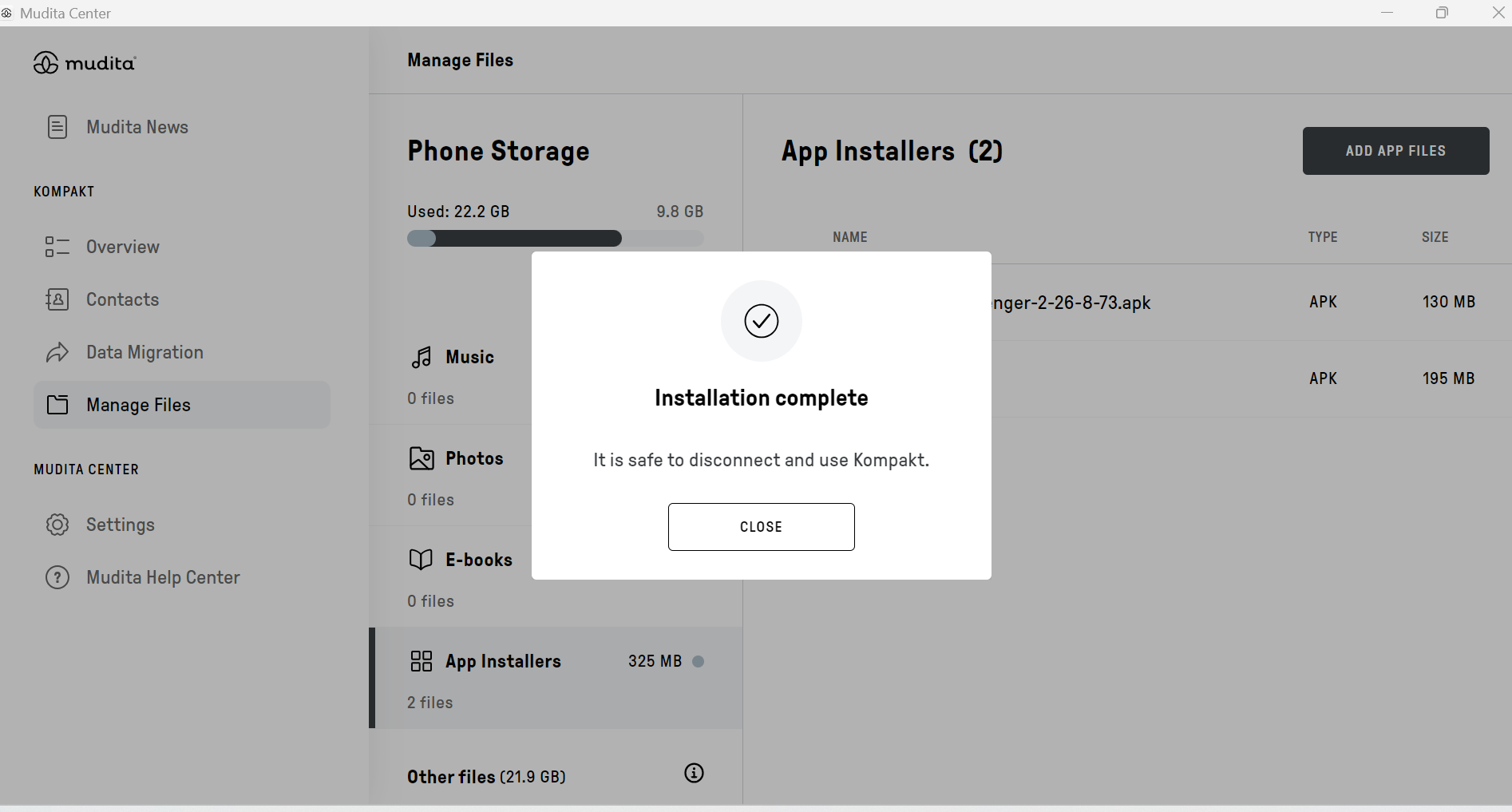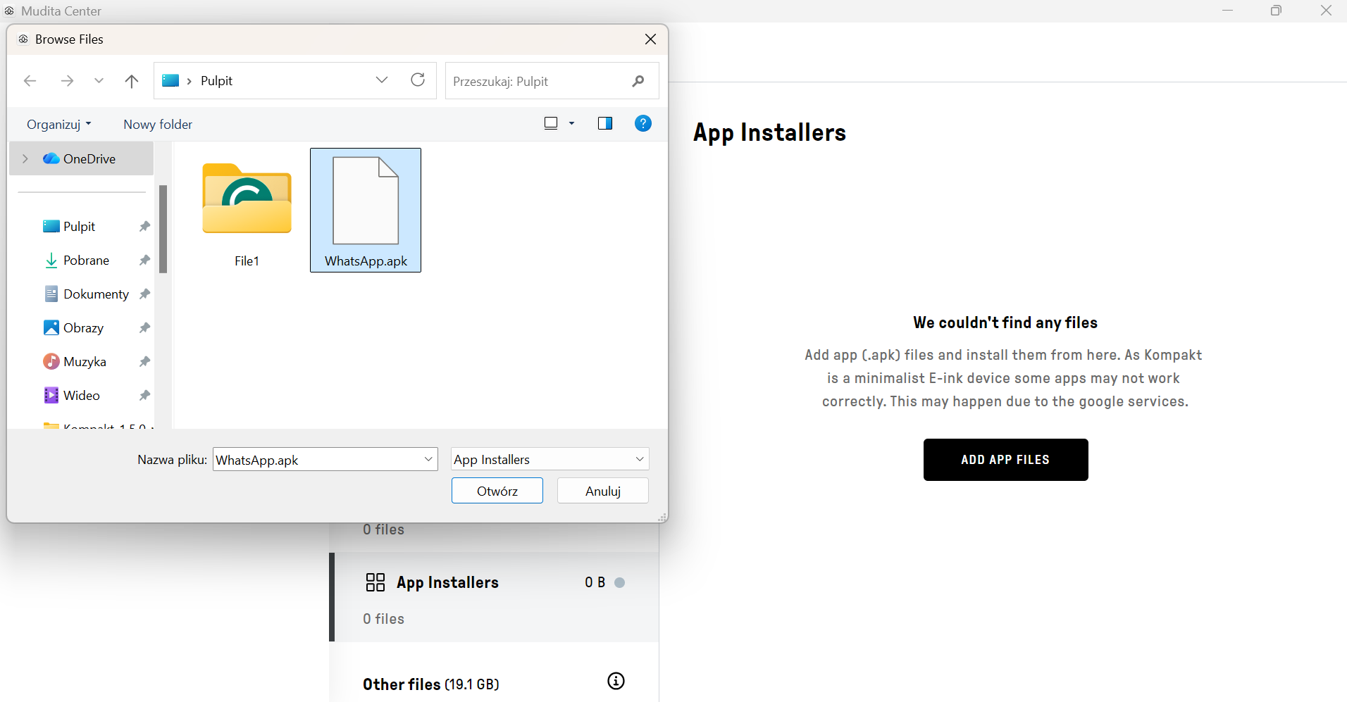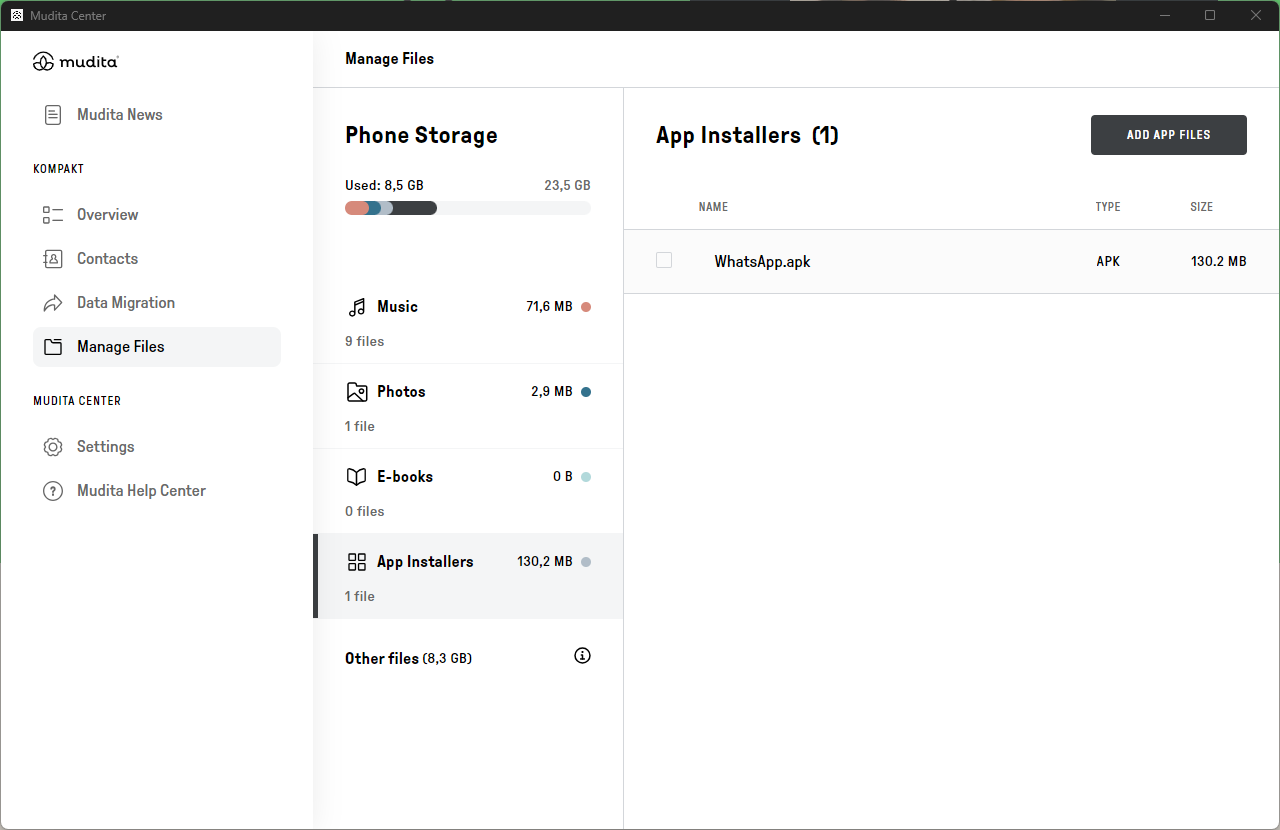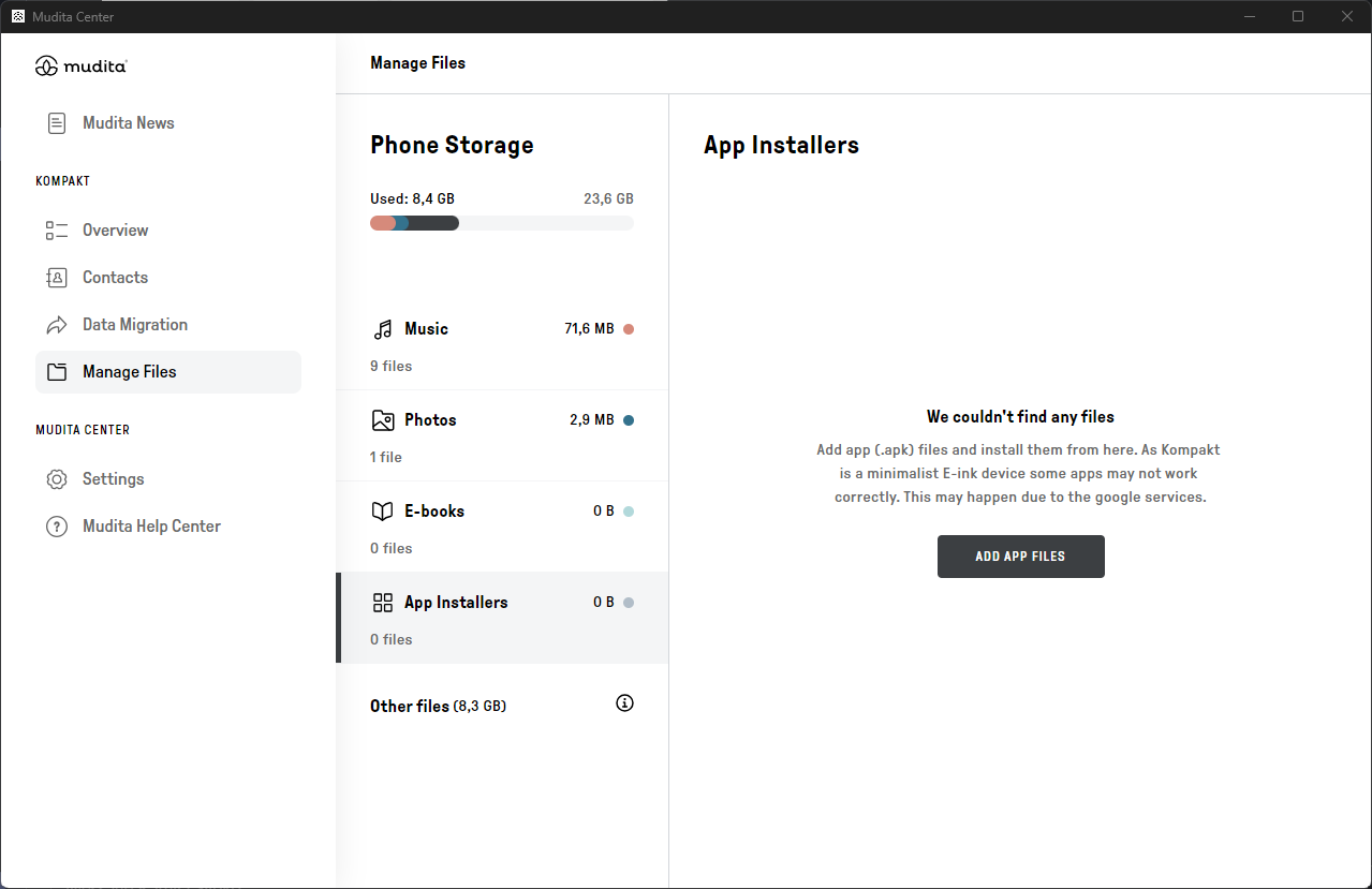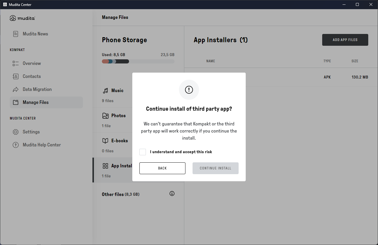 Instalowanie aplikacji zewnętrznych przez Mudita Center Zmodyfikowano dnia: pon, 27 Kwi, 2026 o 11:24 RANO Krok 1. Otwórz Mudita Center i podłącz swoje urządzenie Krok 2. W sekcji „Your Kompakt” kliknij „Manage Files”Krok 3. Przejdź do „Instalatory aplikacji”Krok 4. Kliknij „Dodaj plik” Krok 5. Wybierz pliki .apk, które chcesz przesłać Krok 6. Zatwierdź przesyłanie na KompaktKrok 7. Potwierdź instalację, akceptując ryzyko Krok 7. Otwórz plik .apkKrok 7. Wybierz plik .apk Krok 7. Potwierdź instalację, akceptując ryzyko Krok 8. Instalacja zakończona. Możesz teraz zamknąć to okno i rozpocząć korzystanie z aplikacji na KompakcieKrok 9. Możesz usunąć plik APK, aby zaoszczędzić miejsce. Nie wpłynie to na zainstalowaną aplikację
